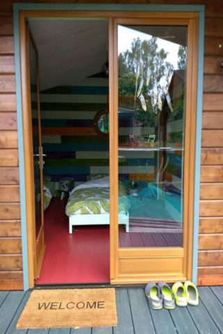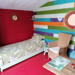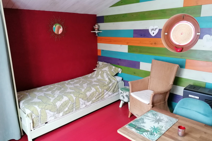 Lits modulables en deux lits simples ou un lit double. Un coin douche, WC ; Une cuisinette entièrement équipée pour préparer des petits repas ; un poêle à pellets pour l’ambiance ; un œil de bœuf qui donne sur le ruisseau et des couleurs pour vous réchauffer le cœur.